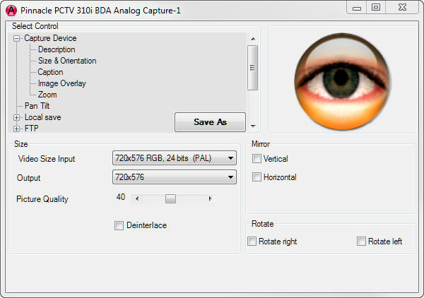 Capture Device Description Size & Orientation Caption Image Overlay Zoom Pan Tilt Local Save Email on Motion Detection FTP Config Files WMV Streaming Effects Video Save TV Tuner Web Video URL Size & Orientation![]() Video Size Input vs. Outputif you want to enable zoom and your device does not support driver zoom, it makes sense to make input size bigger than the output size. Virtual PTZ also works best if the input resolution is set higher than the output resolution. Input size is used for Local Save, FTP Upload and Video Save, Output size for all web output Picture Quality: this setting is used for jpeg and motion jpeg images. Lower values mean lower quality. 40 is the recommended value. Deinterlace: the TyCapture interface offers the Deinterlace option for capture devices with a TV tuner. Mirror: check these checkboxes to mirror the image Rotate: check these checkboxes to rotate the image Help Topics |