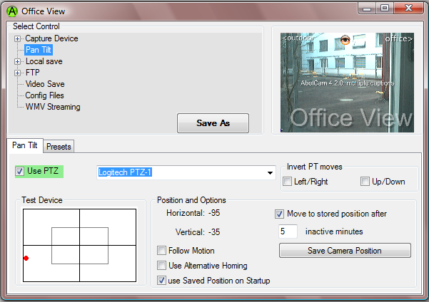 Capture Device Description Size & Orientation Caption Image Overlay Zoom Pan Tilt Local Save Email on Motion Detection FTP Config Files WMV Streaming Effects Video Save TV Tuner Web Video URL Pan Tilt![]() Use PTZ: check this to activate the PTZ device PTZ droplist: select the PTZ device to use with this capture device. Virtual PTZ is available for all capture interfaces. Invert PT moves: check these checkboxes to invert lef/right and/or up/down moves Test Device: click on this control to move the PTZ device. The red dot reflects the current position. Horizontal/Vertical: current PTZ position Follow Motion: check this for the PTZ device to follow detected motion. Use Alternative Homing: check this to use AbelCams internal homing sequence instead of the drivers homing function use Saved Position on Startup: check this for the camera to move to the predefined PTZ position when started. Move to stored position after x minutes: check this for the camera to move to the stored predefined PTZ position when it has not been moved for x minutes. This avoids situations where the camera is looking at a boring location or into the sun. Save Camera Position: click this button to use the current PTZ position as predefined position. For permanent storage you need to hit the Save button afterwards. LED Off is available only for the Logitech Sphere / Orbit MP and AF cameras. IP PTZ is covered in the Wiki Presets Use Presets: check this to show the presets on the web pages generated by the builtin web server New: click here to create a new preset Up/Down Arrows: move the selected preset up/down Delete: delete the selected preset Name: name of the preset to be shown on the web pages Pan: horizontal position Tilt: vertital position Zoom: Zoom value Save: Save this Preset