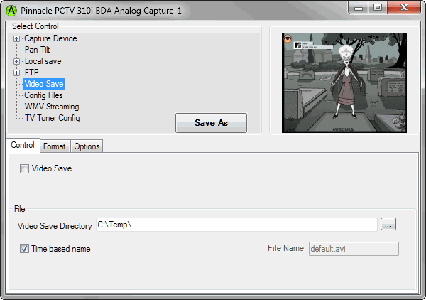 Capture Device Description Size & Orientation Caption Image Overlay Zoom Pan Tilt Local Save Email on Motion Detection FTP Config Files WMV Streaming Effects Video Save TV Tuner Web Video URL Video SaveVideo Save is available with the TyCapture and the VideoCapX interface ![]() More documentation about the options in the Wiki Help Topics |