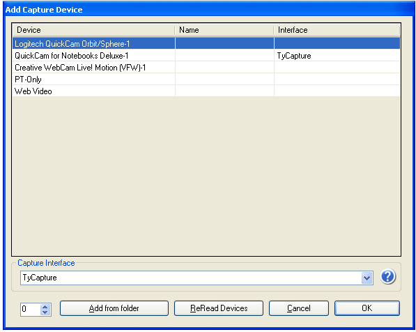 Camera Configuration Add Camera Add Tuner Add Camera![]() Device List: this shows the list of all available capture devices Capture Interface: select one of the available Capture Interfaces Number: select the number for the camera - Experts only Add from folder:select a previously stored configuration from any folder - Experts ReRead Devices: if you plugged a USB interface and it's not showing up in this list, hit ReRead Devices to update the list Cancel: aborts this selection form OK: add the selected capture interface Help Topics |