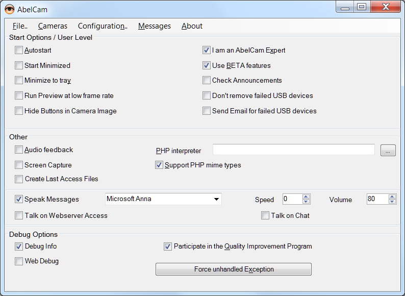 Speak Messages: check this option to let AbelCam talk. Select voice (usually only one is available), talking speed and volume. Whatever shows up in the Messages window will be read.