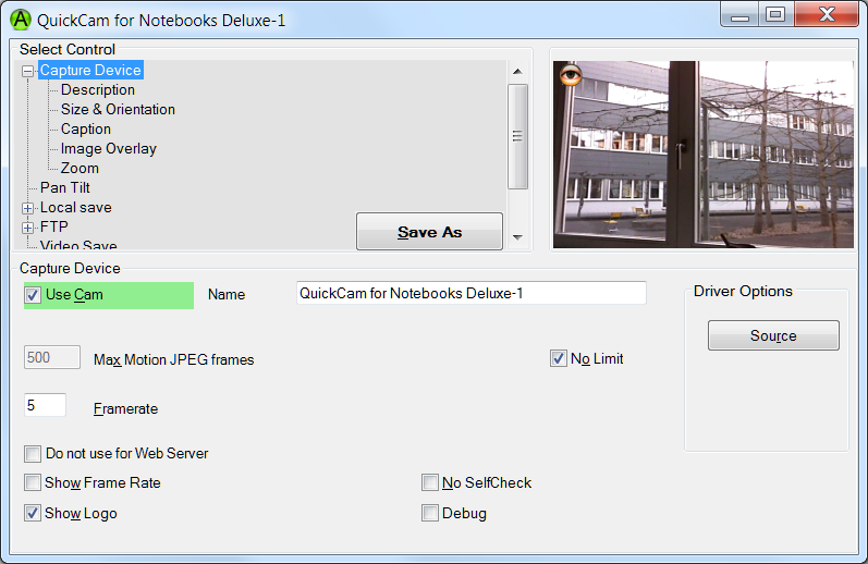 Capture Device Description Size & Orientation Caption Image Overlay Zoom Pan Tilt Local Save Email on Motion Detection FTP Config Files WMV Streaming Effects Video Save TV Tuner Web Video URL Capture Device![]() Capture DeviceUse Cam: This checkbox switches the capture device on and off Name: The name will be used on the web pages Max Motion JPEG frames / No limit: this sets the behaviour for motion JPEG streams. Either set a limit for the number of frames to be transmitted or check No Limit Framerate: this is the frame rate in frames per second Do not use for Web Server: check this if you don't want this camera to be included in the web pages generated by the built in web server (*) Show Frame Rate: if this is checked, the frame rate for both capturing and sending will be shown in the camera list. Show Logo: when this is checked, the camera will show the logo image before starting to stream images (*) Driver Options: These buttons configure the camera driver. What options are available and how they are presented and stored is up the camera driver. Debug: check this to include this camera in the debug log (*) (*) these options are available only if I am a AbelCam Expert is checked Help Topics |