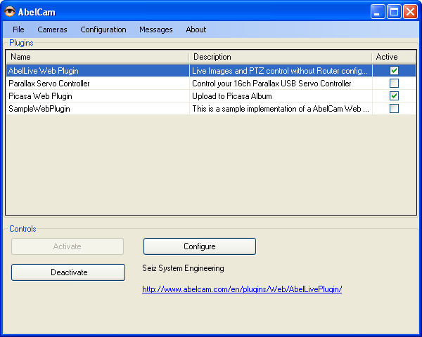 User Information and License Camera Licenses Options Scheduler Self Check Web Server Basic Internet Passwords Commands Proxy IP Filters Plugins PluginsThis form lists all the plugins available in AbelCams program Plugin\Web folder. ![]() Select and Activate a plugin, then configure it. When you Save your settings, the plugin state will be stored as well. On Restart, AbelCam will start active plugins. Help Topics |