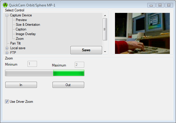 Capture Device Description Size & Orientation Caption Image Overlay Zoom Pan Tilt Local Save Email on Motion Detection FTP Config Files WMV Streaming Effects Video Save TV Tuner Web Video URL Zoom![]() Minimum: this is the limit for zooming out. Maximum: this is the limit for zooming in. Values bigger than 4 don't make sense as the picture quality gets bad In: click here to zoom in Out: click here to zoom out Use Driver Zoom: check this to use the capture device driver zoom Driver Zoom is available for the following PTZ cameras: