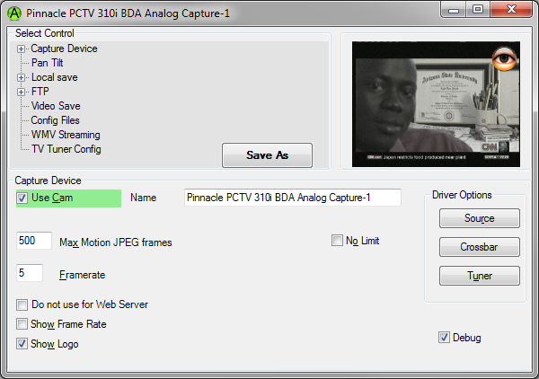 Capture Device Description Size & Orientation Caption Image Overlay Zoom Pan Tilt Local Save Email on Motion Detection FTP Config Files WMV Streaming Effects Video Save TV Tuner Web Video URL Capture Device![]() Capture DeviceUse Cam: This checkbox switches the capture device on and off Name: The name will be used on the web pages Max Motion JPEG frames / No limit: this sets the behaviour for motion JPEG streams. Either set a limit for the number of frames to be transmitted or check No Limit Framerate: this is the frame rate in frames per second Do not use for Web Server: check this if you don't want this camera to be included in the web pages generated by the built in web server (*) Show Frame Rate: if this is checked, the frame rate for both capturing and sending will be shown in the camera list. Show Logo: when this is checked, the camera will show the logo image before starting to stream images (*) Driver Options: These buttons configure the camera driver. What options are available and how they are presented and stored is up the camera driver. Debug: check this to include this camera in the debug log (*) (*) these options are available only if I am a AbelCam Expert is checked Help Topics |